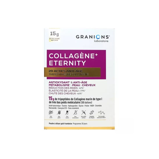 A composição de Granions Collagène Eternity inclui ingredientes como hidrolisado de colágeno de peixe, aroma natural de framboesa, e uma variedade de extratos de plantas e vitaminas. Recomenda-se consultar um profissional de saúde para uma supervisão adequada no uso deste produto.