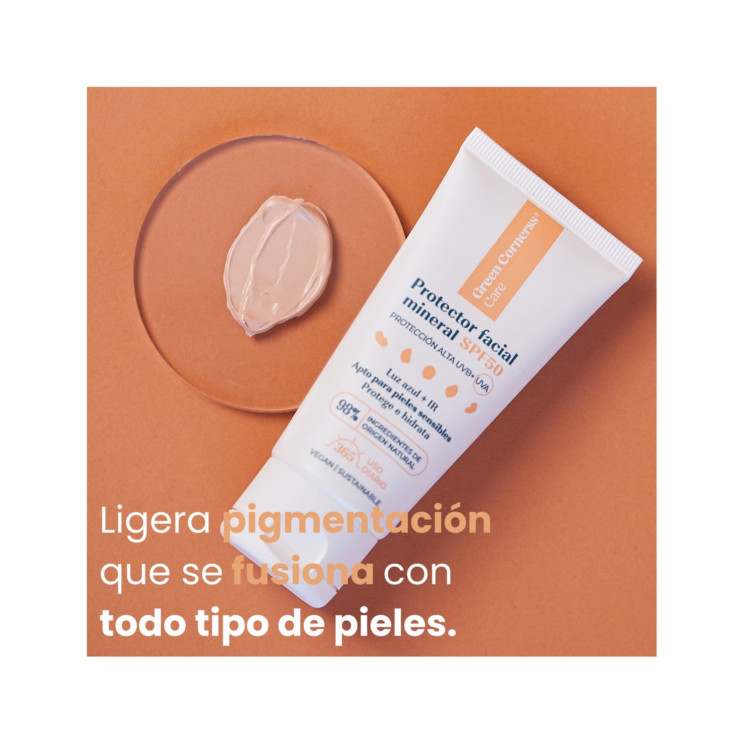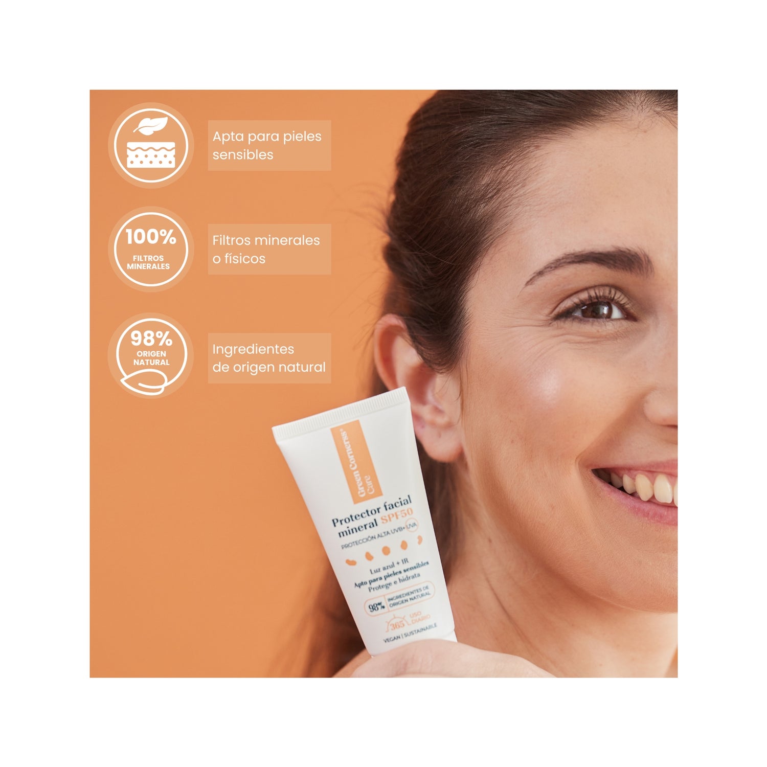 Green Cornerss Protetor Facial Mineral SPF50 de 50 ml é um fotoprotetor de amplo espectro, completamente mineral e com cor. Este produto garante uma proteção eficaz contra as quatro principais radiações solares: UVB, UVA, luz azul e IR-A, ao mesmo tempo que realça a luminosidade natural da pele.