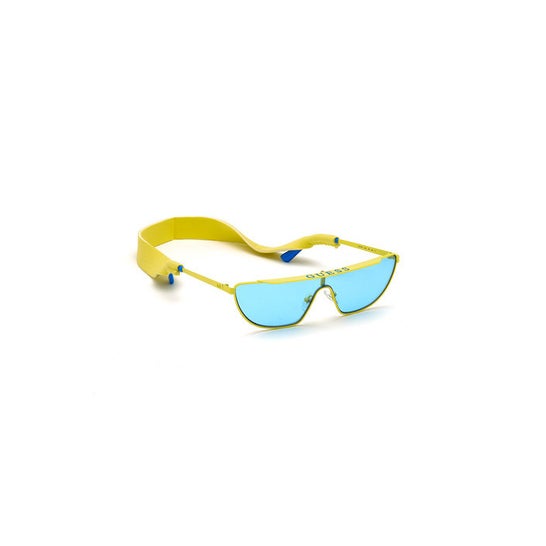 Óculos de sol com índice de proteção solar UV400. Têm lentes azuis que actuam como uma barreira contra os raios solares nocivos. Ajudam a prevenir o fotoenvelhecimento dos olhos e a manter uma visão clara. Têm também uma armação em metal amarelo com hastes flexíveis que se adaptam confortavelmente a todas as anatomias. Ajudam a proteger contra a secura ocular de uma forma natural. Incluem um laço para pendurar ao pescoço. Adequados para passeios ao ar livre, locais com muita luz ou para complementar qualquer visual. Testado oftalmologicamente.