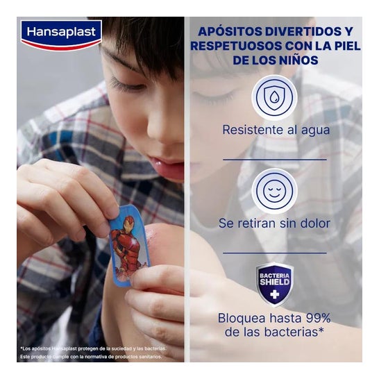 Hansaplast Marvel Curativos 20uds são curativos de 2 tamanhos com estampado de super-heróis Marvel, adequados para cobrir e proteger feridas menores. Repelentes de água e sujeira, bloqueiam até 99% das bactérias.