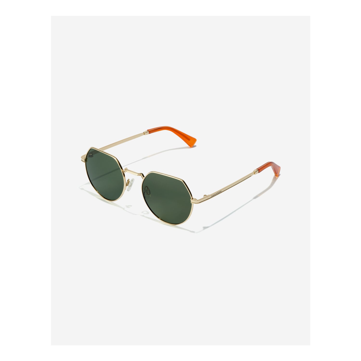 Hawkers Aura Polarized Green 1ud é um modelo de óculos de sol com um design assimétrico que apresenta uma frente semi-arredondada, acentuada por linhas retas na parte superior. A armação é confeccionada em metal dourado com um acabamento brilhante, e conta com lentes em um tom verde crocodilo e terminais em laranja transparente. Seu ponte angulado ressalta seu estilo audacioso.