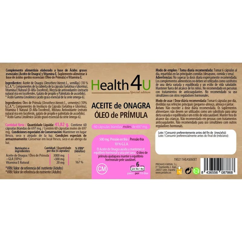 Health4U Óleo de Onagra Edição Especial 60caps é um suplemento alimentar que oferece uma fórmula concentrada de 500 mg de óleo de onagra por cápsula, que contém 10% de ácido gamma-linolênico (GLA). Este óleo é extraído a partir das sementes de Oenothera biennis L. por meio de um processo de prensagem a frio, o que assegura a conservação de suas propriedades.