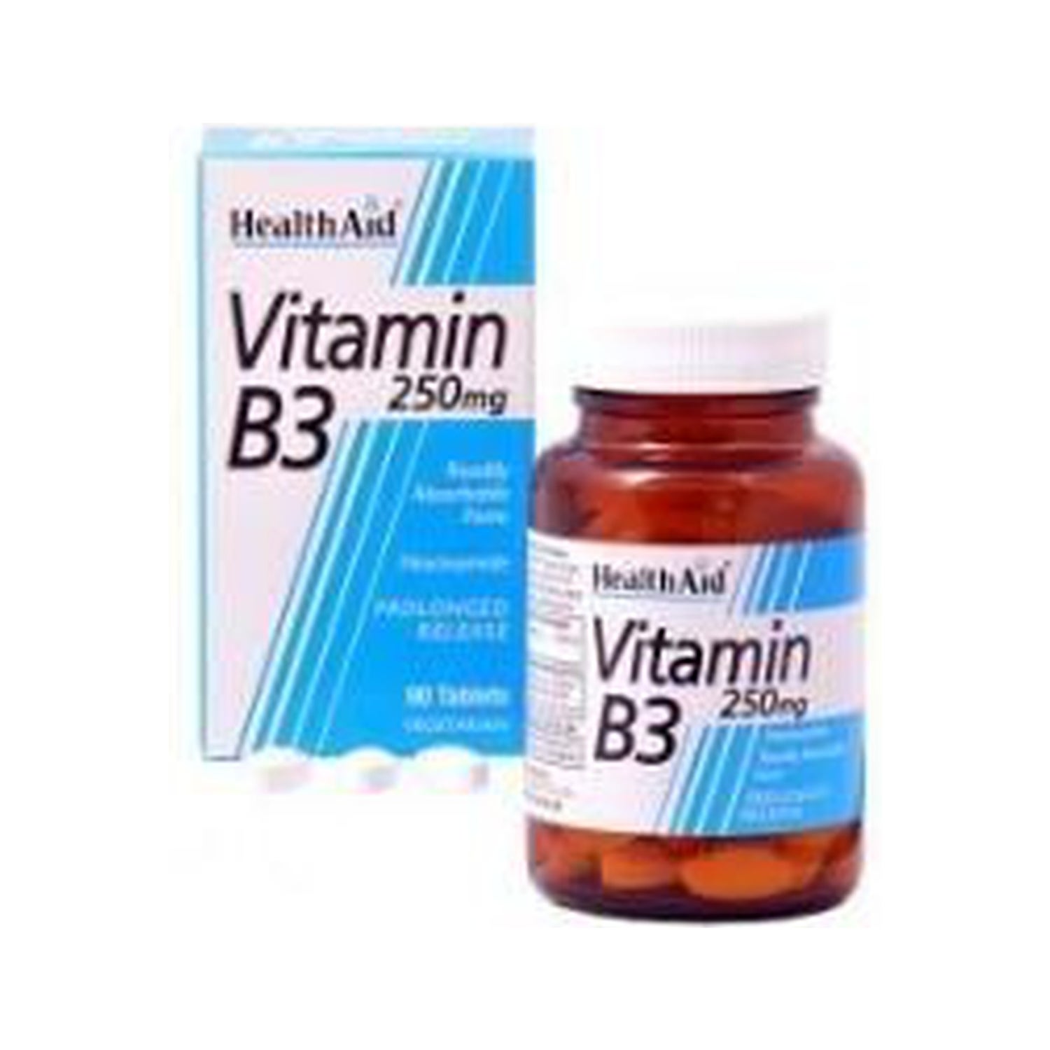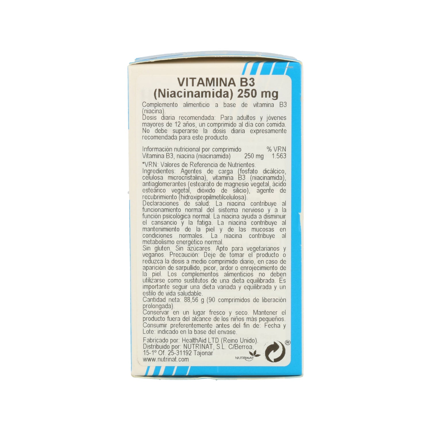 Suplemento alimentar de libertação prolongada em comprimidos, à base de niacinamida, uma forma de vitamina B3 que é um nutriente essencial para várias funções do organismo, como o funcionamento do cérebro, a digestão e o sistema nervoso.