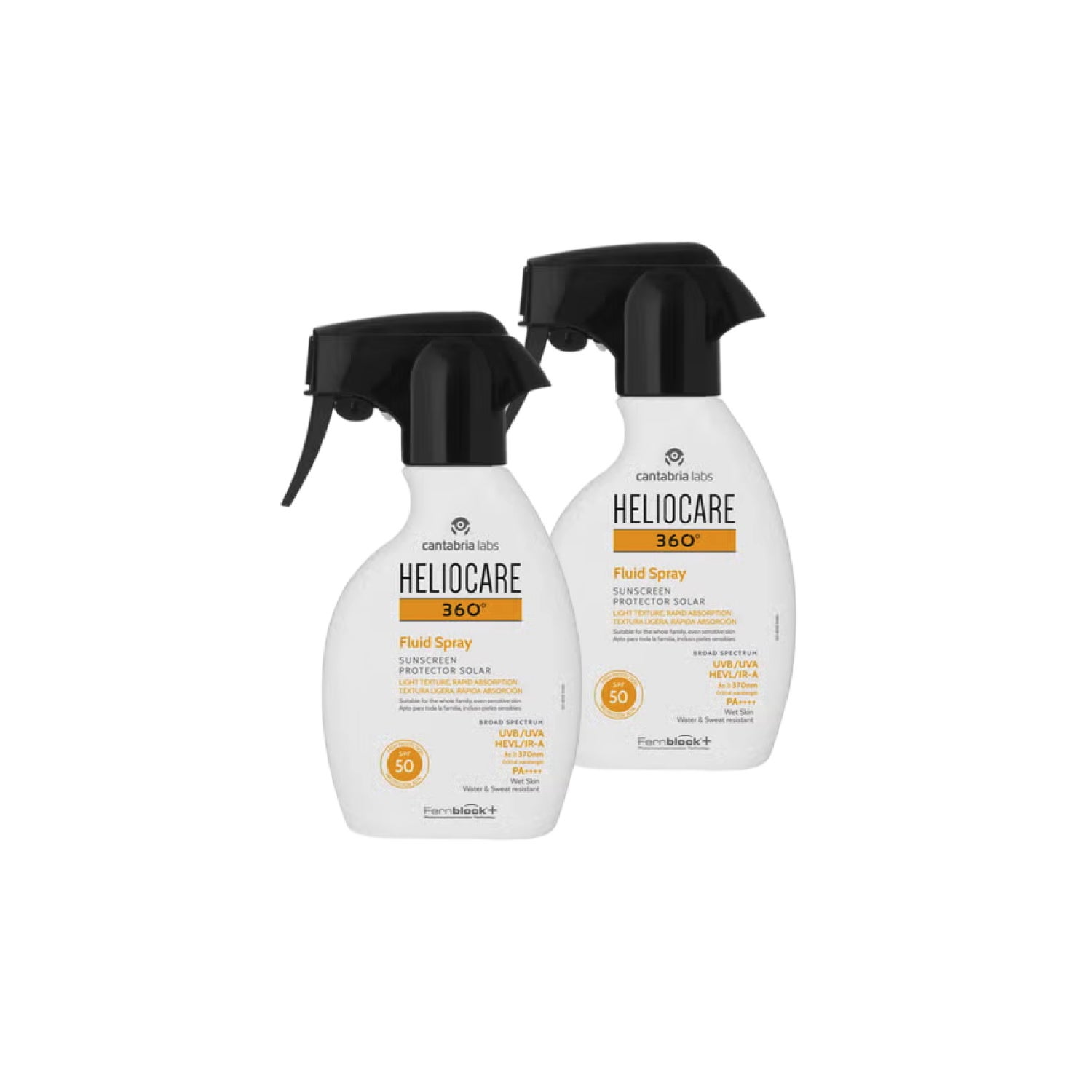 Heliocare Pack 360º Fluid Spray SPF50 2x 250ml é um protetor solar que, graças à sua fórmula com filtros específicos e Fernblock®, oferece proteção de amplo espectro (SPF50, PA++++, UVB, UVA, visível e infravermelho) para todo tipo de pele. De rápida absorção, é fácil de aplicar e deixa um acabamento suave e sedoso, contribuindo para hidratar a pele. É antioxidante, resiste à água e ao suor.