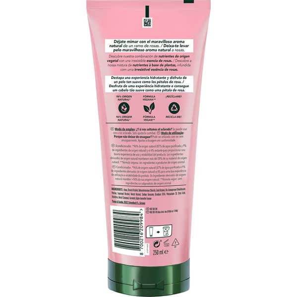 Este condicionador combina nutrientes de origem vegetal junto com essência de rosa autêntica, que é obtida manualmente em Grasse, no sul da França. A fórmula é vegana, o que a torna adequada para quem busca produtos que respeitem o bem-estar animal.