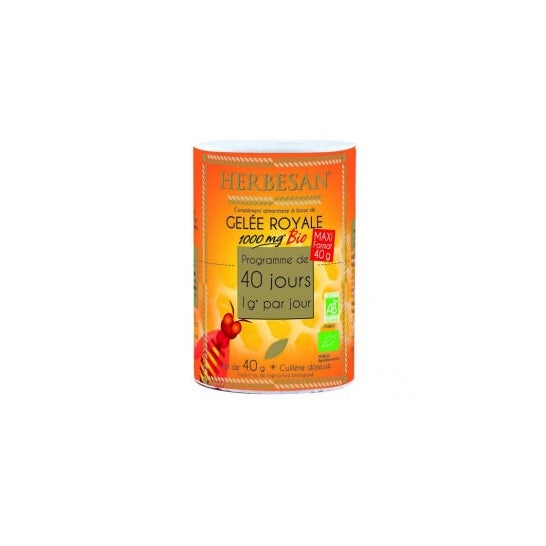 As abelhas rainhas alimentam-se exclusivamente de geleia real, o que lhes permite viver mais tempo do que as abelhas operárias. A geleia real ajuda a combater a fadiga. Ajuda também a enfrentar o inverno e as mudanças de estação. Uma colher de sopa contém uma média de 1000 mg de geleia real. Embalagem original para a proteger do calor e da luz. Colher de medida incluída. INFORMAÇÕESA geleia real Herbesan 1000mg é um suplemento alimentar biológico à base de geleia real que contribui para o bom funcionamento do sistema imunitário. Dá tónus e vitalidade ao organismo.