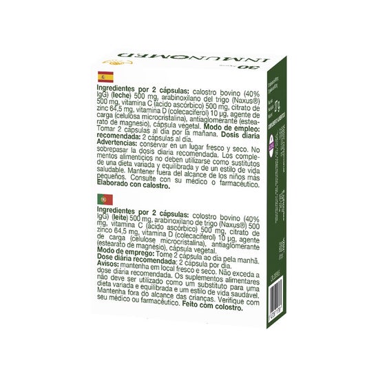 Suplemento alimentar formulado com colostro bovino e zinco. Contribui para reforçar o sistema imunitário e melhorar o funcionamento da flora intestinal. Enriquecido com vitaminas C e D, que ajudam a reduzir a sensação de cansaço e aumentam a absorção de cálcio nos ossos. Favorece também a eliminação de agentes patogénicos do organismo e promove o desempenho muscular e intelectual.