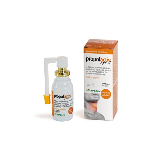 Herbora Propolactiv Spray 30 Ml, à base de Própolis, Erisimo, Equinácea, Agrimônio, Vitaminas A e C, óleo essencial de Eucalipto e Tomilho.É indicado para combater o desconforto, comichão e dores de garganta causadas pelo frio, mudanças de temperatura e poluição.