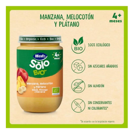 Sobremesa orgânica feita de puré de maçã, banana e pêssego, recomendada para bebés a partir dos 4 meses de idade. Contribui para a alimentação complementar dos mais pequenos, é uma fonte natural de fibras, vitaminas e minerais essenciais para o bom funcionamento do organismo. Com ingredientes seleccionados, 100% da agricultura biológica. Favorece a introdução de alimentos sólidos na dieta do bebé. Apresentado numa garrafa de vidro reciclável. Livre de leite, glúten, ovo e bisfenol A.
