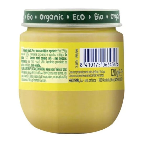 Hero Baby Solo Pear & Apple 120g é um pequeno frasco feito exclusivamente com pera e maçã biológicas, sem adição de açúcares. Este alimento é especialmente adaptado nutricionalmente para bebés a partir dos 4 meses de idade.