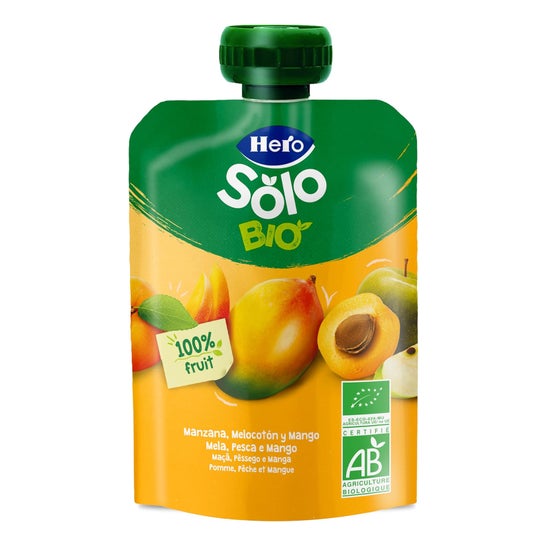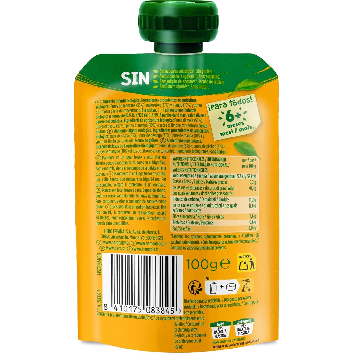 Hero Pouch Maçã Pêssego Manga 100 g é alimentação complementar ecológica para bebês a partir de 6 meses. Combina maçã, pêssego e manga com ingredientes 100% ecológicos. Não contém açúcares adicionados nem glúten.