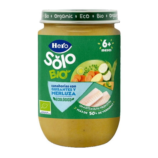 Hero Solo Bio Cenouras com Ervilhas e Merluza é um potinho ecológico projetado para bebês a partir de seis meses. Este purê contém mais de 50% de verduras e é elaborado com ingredientes 100% ecológicos, o que o torna uma opção saudável para a introdução de novos sabores naturais na alimentação infantil. Além disso, é um produto sem glúten, ideal para os menores.