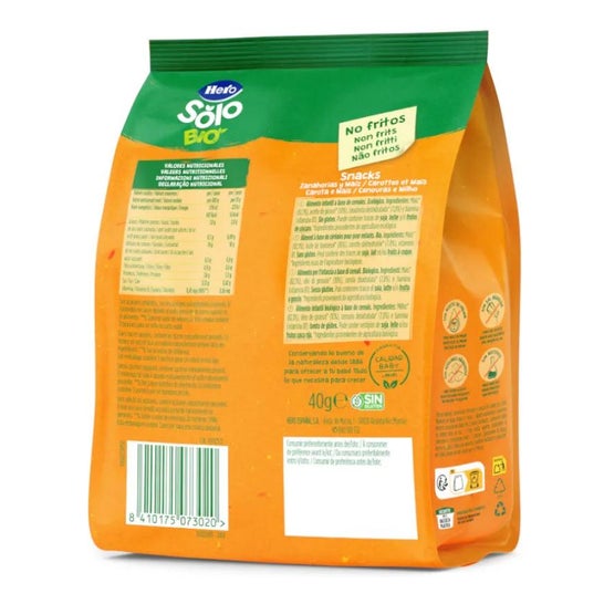 Snacks de cenoura e milho especialmente indicados para oferecer uma dieta saudável às crianças a partir dos 10 meses de idade. Os legumes e cereais utilizados como ingredientes não foram fritos e não contêm conservantes, corantes ou sal adicionado. Hero Solo faz os seus petiscos apenas com matérias-primas 100% orgânicas.