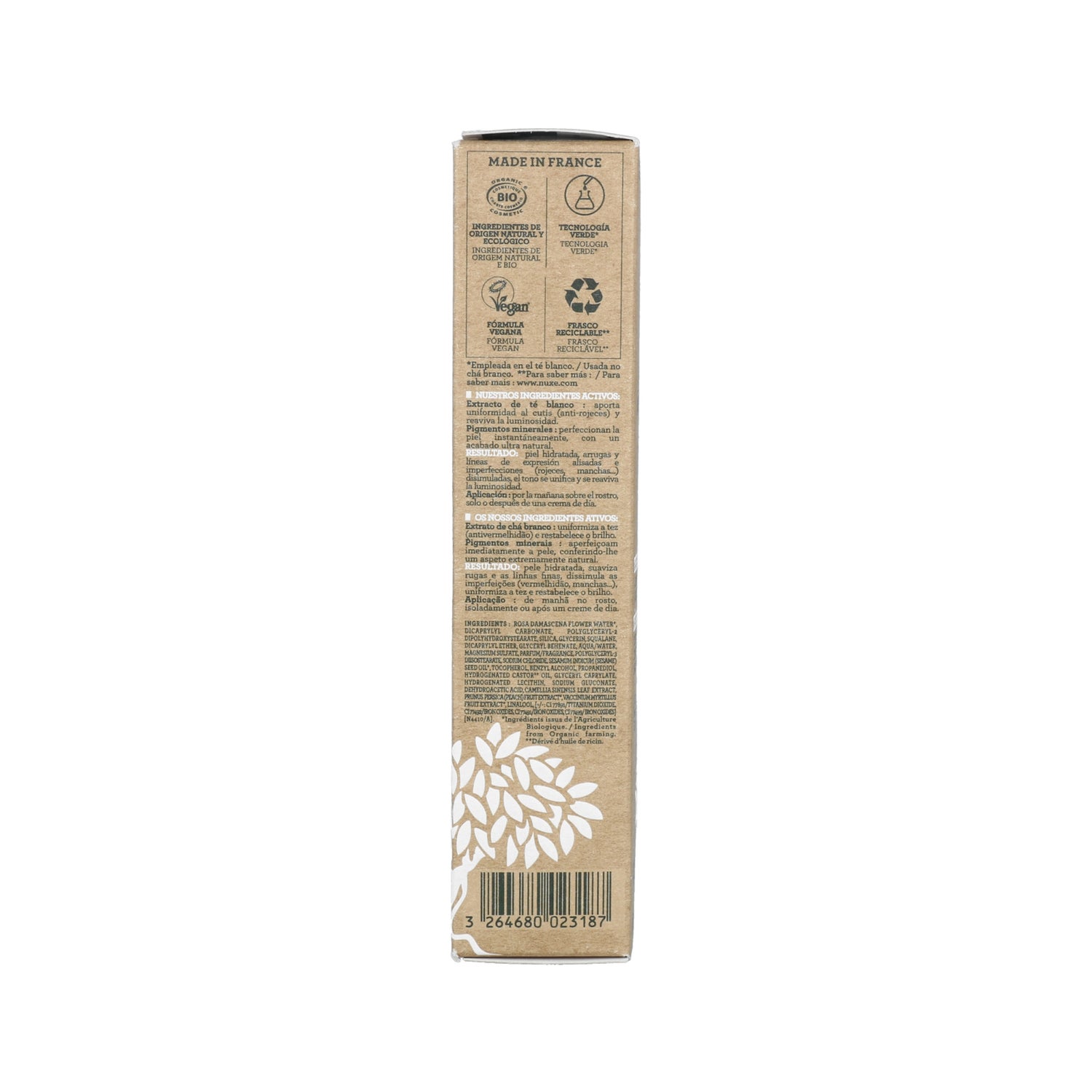 Fórmula vegana (aprovada pela The Vegan Society). Produto biológico certificado. Estojo de conceção ecológica, fabricado a partir de uma combinação de fibras recicladas e virgens.