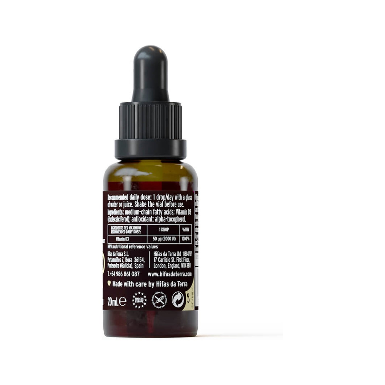 Hifas Da Terra CocoVit D 20ml é uma vitamina D3 líquida altamente concentrada e biodisponível em óleo MCT, extraída do óleo de coco. Contribui para o funcionamento normal do sistema imunológico e para a absorção e utilização normal do cálcio e do fósforo.