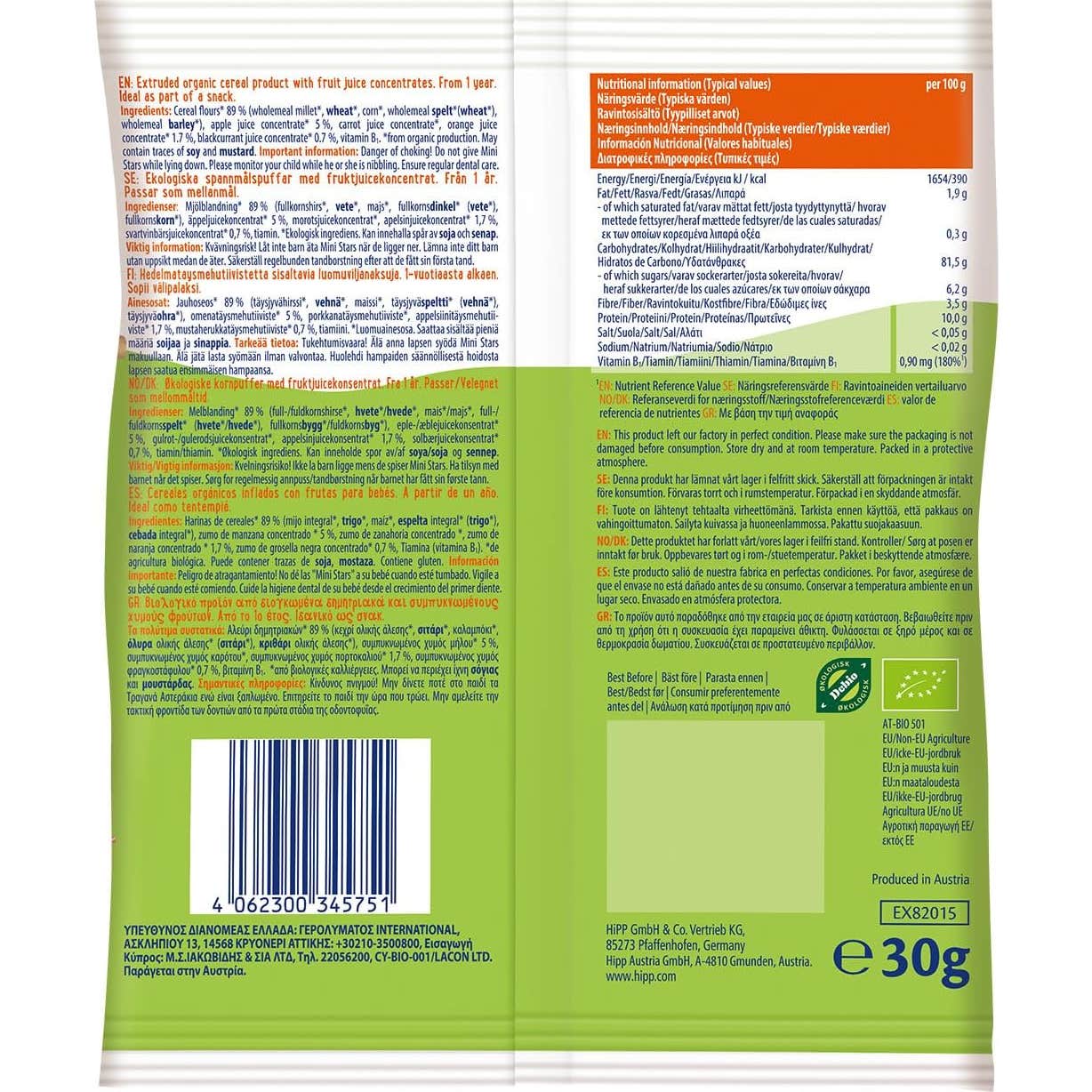 Hipp Bio Estrelas com Frutas Snack conta com a reconhecida qualidade orgânica da HiPP, o que o torna uma opção segura e confiável. Este lanche é ideal para desfrutar entre as refeições, seja em casa ou durante as viagens, e seu tamanho é perfeito para mãos pequenas. Recomenda-se supervisionar o consumo por parte de um adulto.