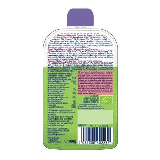 Hipp Pouches Pêssego Maçã e Frutos do Bosque 100g é uma opção ideal para que os mais pequenos desfrutem de um lanche saudável. Estas bolsinhas de purê de fruta são elaboradas exclusivamente com ingredientes orgânicos, garantindo um sabor autêntico e natural.