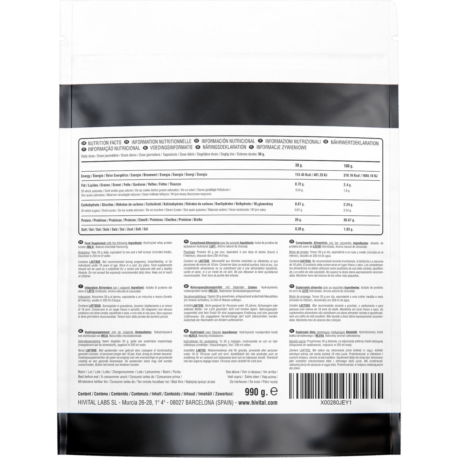 A MELHOR ISOLATE WHEY: Cada dose de 30 gramas de pó contém 26 gramas de proteína pura, das quais 26 g. (100%) procedem de Isolado Natural de Proteína Hidrolisada de Soro de LEITE. Sem açúcares adicionados. Contém LACTOSE.