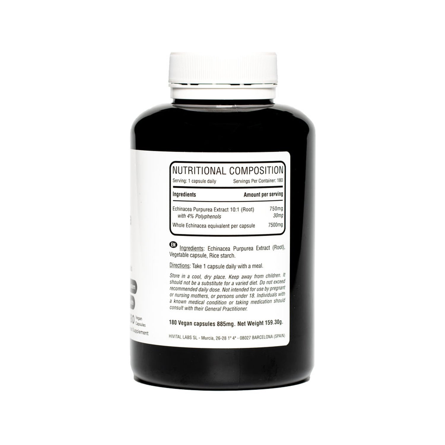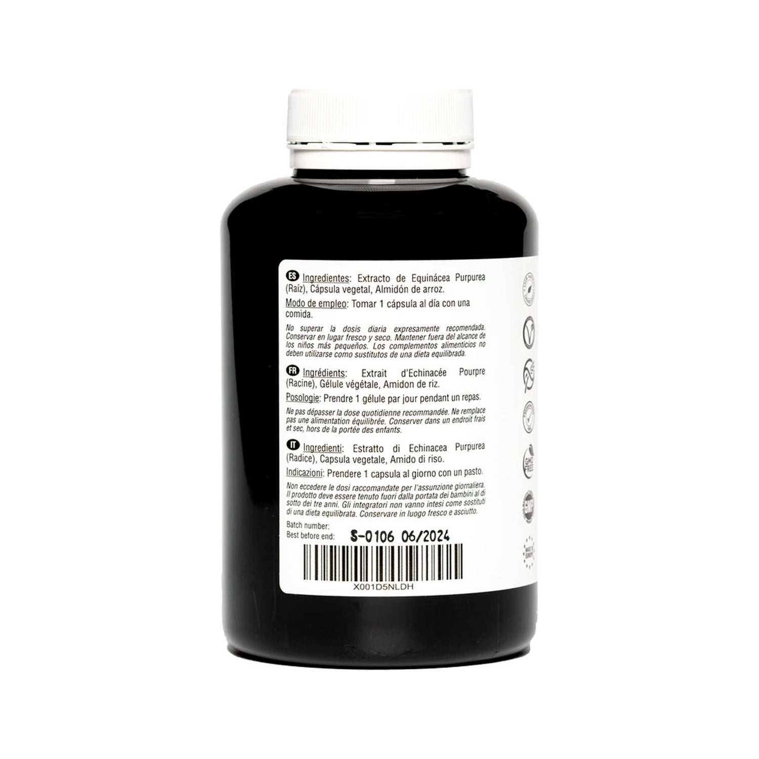 Suplemento alimentar em forma de cápsulas. Formulado à base de Echinacea purpurea, indicado para estimular o sistema imunitário. Ajuda a prevenir e a acelerar a cura das constipações. A sua ação ajuda a acalmar a garganta, a faringe e as cordas vocais. Não contém açúcar, conservantes ou corantes e é adequado para veganos.