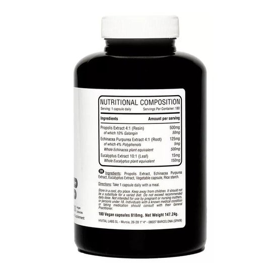 Cápsulas concebidas com própolis, equinácea e eucalipto para ajudar a manter a saúde do sistema respiratório. Também ajuda a fortalecer o sistema imunitário, especialmente interessante durante os meses mais frios do ano. A sua composição não contém glúten, lactose ou açúcar, pelo que são adequadas para pessoas com intolerâncias alimentares.