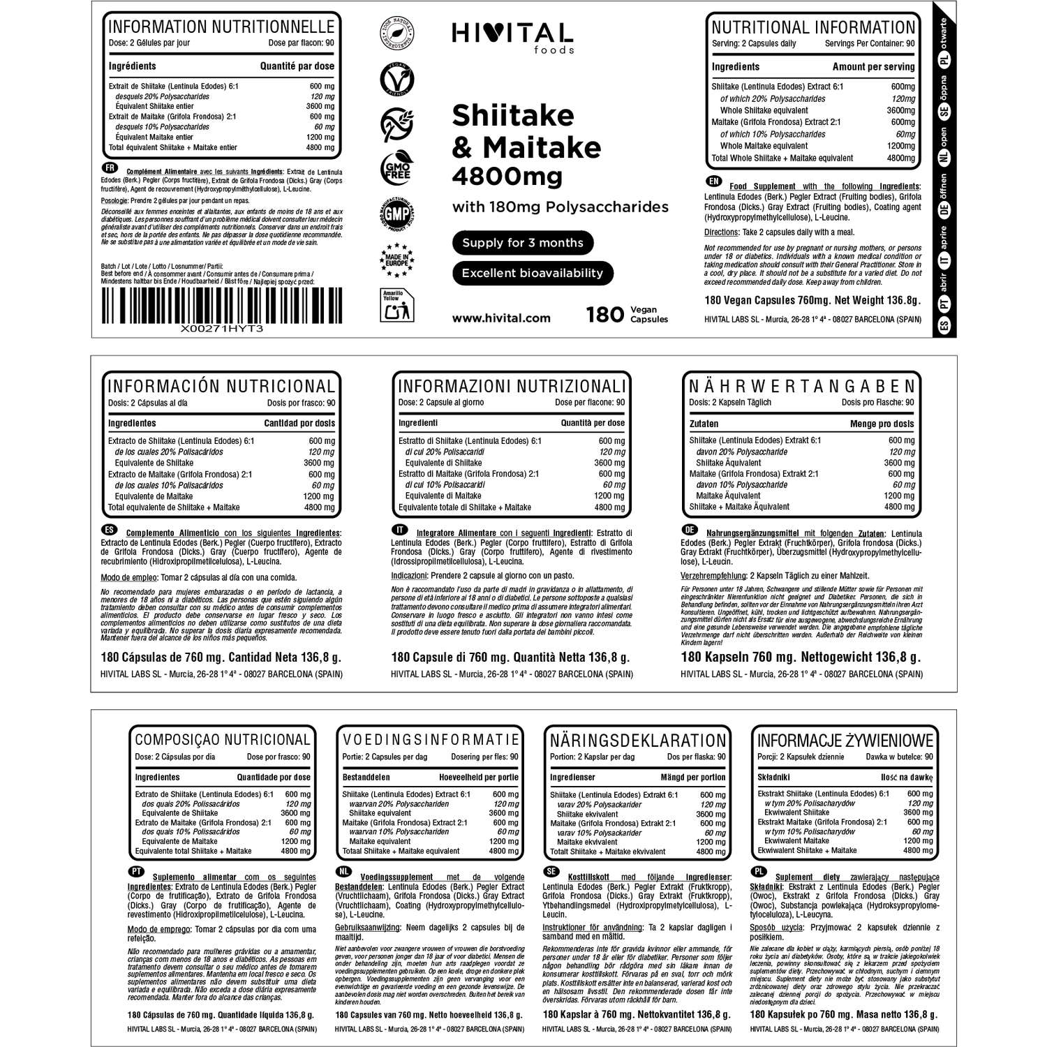 FABRICADO NA ESPANHA sob certificados GMP e ISO. Hivital Foods está registrada na AESAN com número 26.019181B.