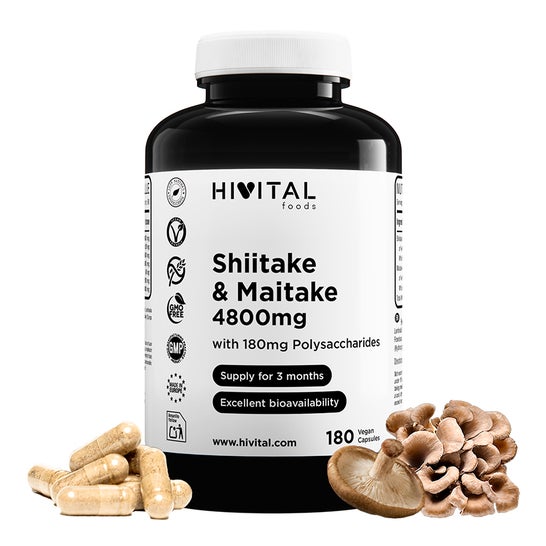 No total equivale a 4800 mg de Shiitake + Maitake com 180 mg de Polissacarídeos por dose.
