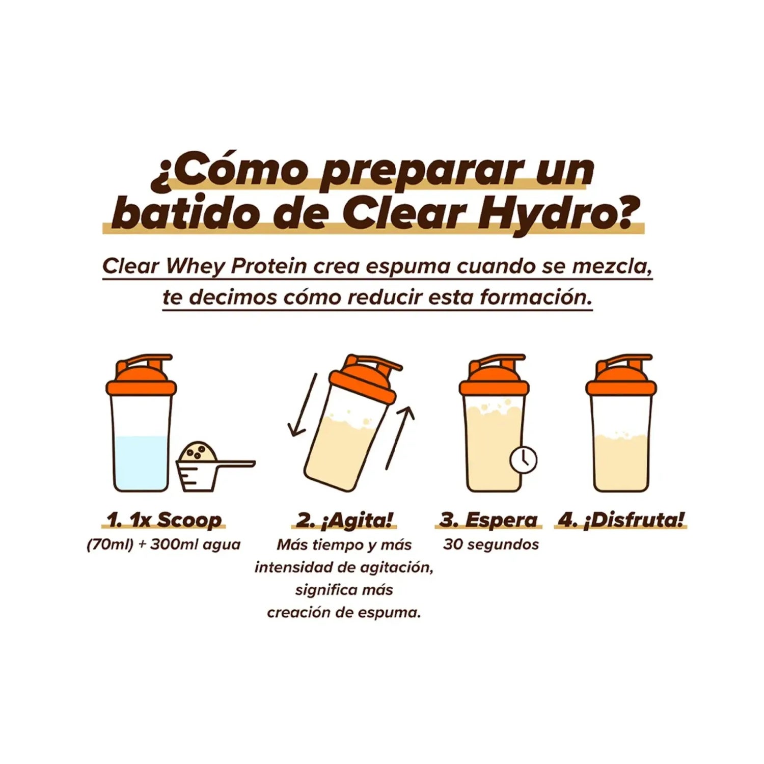 Proteína Clear Whey. Hidrolisado de isolado de soro de leite. Alta fluidez, sem textura de leite. 'O autêntico suco proteico'. Sabores irresistíveis. Baixo teor de açúcares. +80% Proteínas. Adequado para dietas vegetarianas.