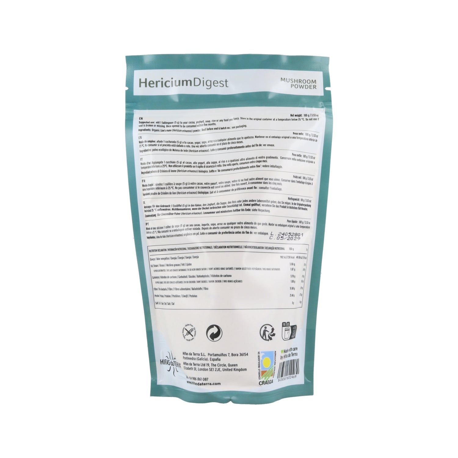 Comida orgânica feita com cogumelos de crina de leão em pó. O Mano de Leão, ou Hericium erinaceus, é um fungo com propriedades medicinais, ajuda na recuperação de feridas causadas no sistema nervoso, estimulando o crescimento e a reparação dos neurónios. É uma fonte natural de proteínas, fibras e polissacarídeos. Produto orgânico certificado pela União Europeia. Também é adequado para celíacos, intolerantes à lactose, veganos e vegetarianos.