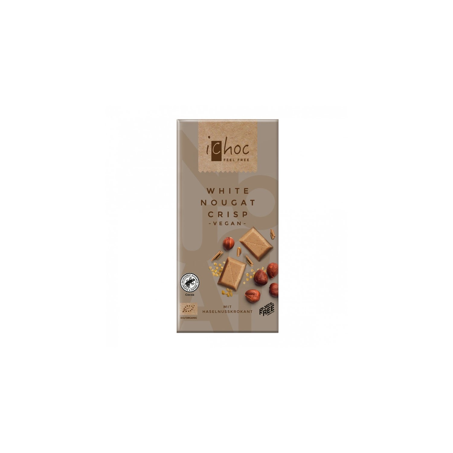 Chocolate branco com nougat de avelã. Sabor a chocolate branco suave e cremoso com nougat de verdade. Com açúcar de cana inteiro. Feito com ingredientes cultivados organicamente. A intensa concha desenvolve os aromas ricos de cacau e a textura fina. Pode conter vestígios de nozes, leite, soja e derivados.