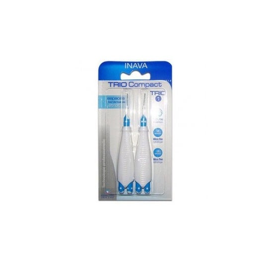 CARACTERÍSTICAS DA ESCOVA: - Escova cilíndrica (ou cabeça de escova) constituída por filamentos de nylon flexíveis dispostos em hélice à volta de uma haste rígida e torcida de aço inoxidável. Montada numa ponta de plástico resistente e flexível, permite alcançar as zonas de difícil acesso Diâmetro 1,9 mm (MICRO FINE CYLINDRICAL), ponta AZUL com pontos brancos. - Cabo de plástico compacto, curto, plano e branco, com superfície antiderrapante para uma boa aderência. Cada cabo tem 3 escovas finas e flexíveis: uma na extremidade e duas na base do cabo. As escovas de substituição são vendidas separadamente e podem ser adaptadas ao modelo INAVA FLEX. Embalagem blister de 2 cabos + 6 cabeças de escovaINFORMAÇÃOMini escova utilizada, para além da escovagem, para: - limpar espaços interdentários estreitos, - escovar aparelhos ortodônticos e dentaduras. Modelo composto por 3 escovas de tamanho IDÊNTICO (microfina cilíndrica), no mesmo cabo para se adaptar aos espaços interdentários estreitos.