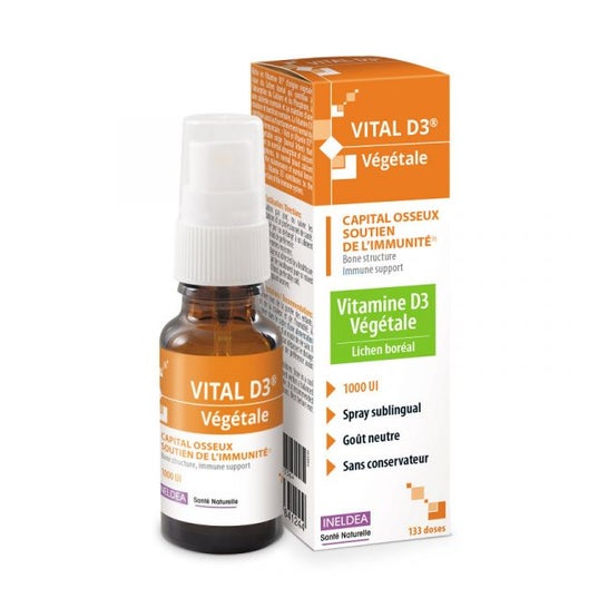 Suplemento alimentar em formato de spray oral formulado com vitamina D3 altamente absorvida. A vitamina D é um nutriente essencial para o organismo, pois contribui para manter ossos e dentes normais, pois está envolvida na absorção de cálcio e na função muscular. Ajuda a fortalecer o sistema imunitário. Contém uma quantidade de 300 doses. Produto fabricado em França. Sabor neutro, sem conservantes.