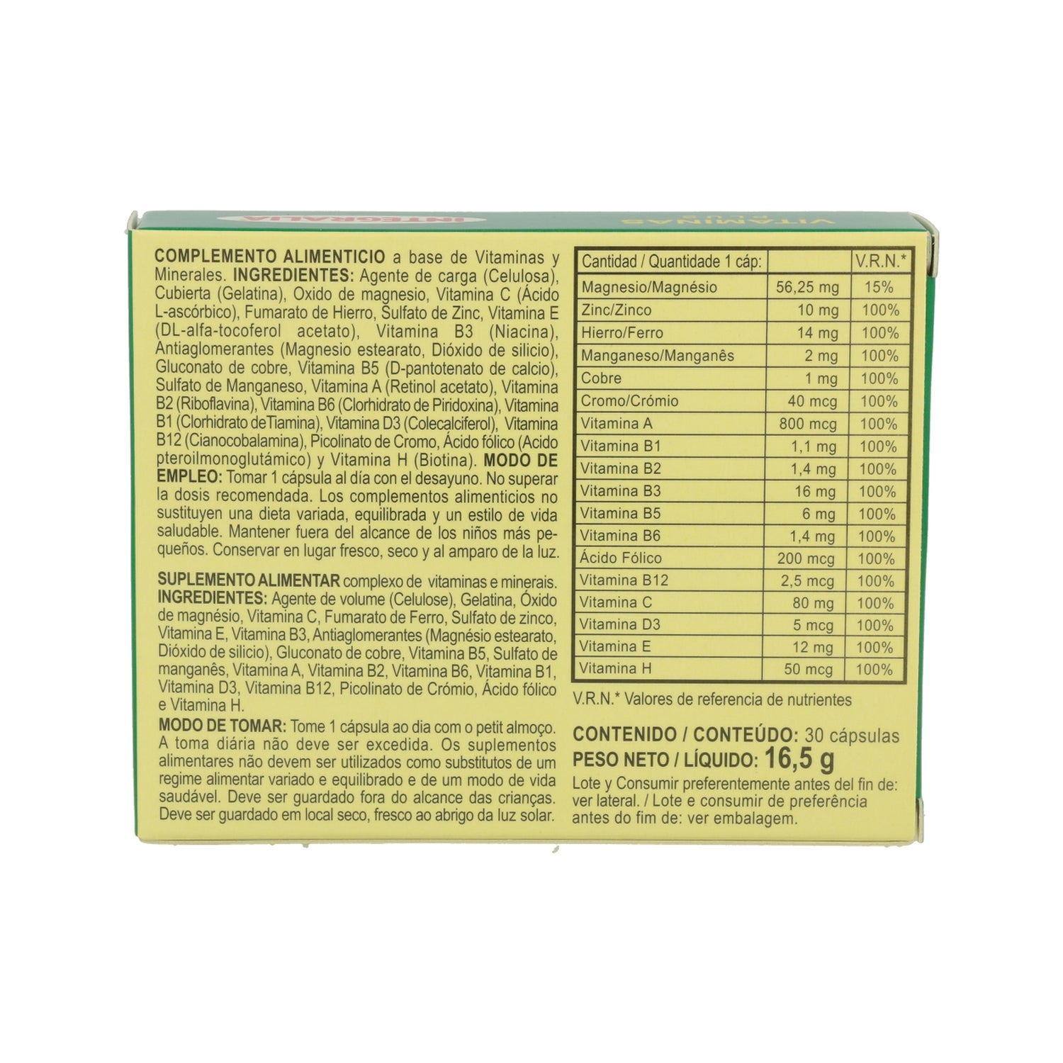 Suplemento nutricional que fornece vitaminas e minerais para o bom funcionamento do organismo. As vitaminas são compostos orgânicos necessários para a manutenção da boa saúde e da integridade dos processos metabólicos. Sua função principal é participar no controle do metabolismo energético, mineral e dos princípios imediatos, embora algumas delas tenham atividades específicas. Não exceder a dose recomendada. Os suplementos alimentares não substituem uma dieta variada, equilibrada e um estilo de vida saudável. Manter fora do alcance das crianças mais pequenas. Conservar em local fresco, seco e protegido da luz.