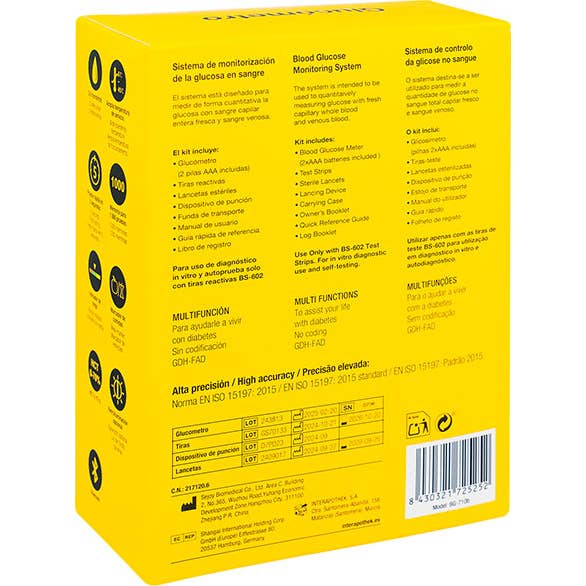 Interapothek Medidor de Glicose Bg 710B 1 ud para medição de glicose capilar permite controlar a glicose capilar de forma precisa e simples. Oferece resultados em 5 segundos e requer uma amostra mínima de 0,6 µL.