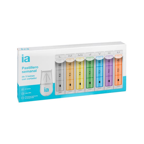 Este pastilleiro inclui um cortador de comprimidos, o que facilita a dosagem precisa dos medicamentos. É ideal para aquelas pessoas que requerem um controle rigoroso na administração de seus tratamentos. Sua estrutura permite um acesso simples e rápido a cada compartimento, garantindo que se possa acompanhar adequadamente as tomadas.