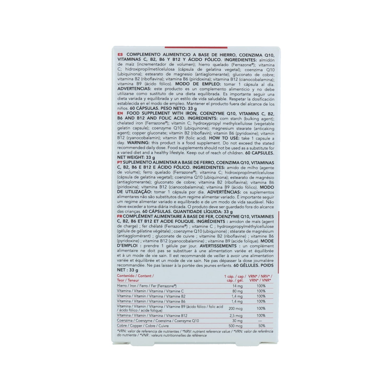 Suplemento alimentar para melhorar a saúde do organismo. Fornece ferro, ácido fólico, vitaminas C, B2, B6 e B12 e coenzima Q10. A vitamina C ajuda a melhorar a absorção do ferro e tem propriedades antioxidantes. O ferro promove a formação de glóbulos vermelhos e hemoglobina no sangue. Com folatos para ajudar a reduzir o cansaço e a fadiga. Sem sabor metálico.