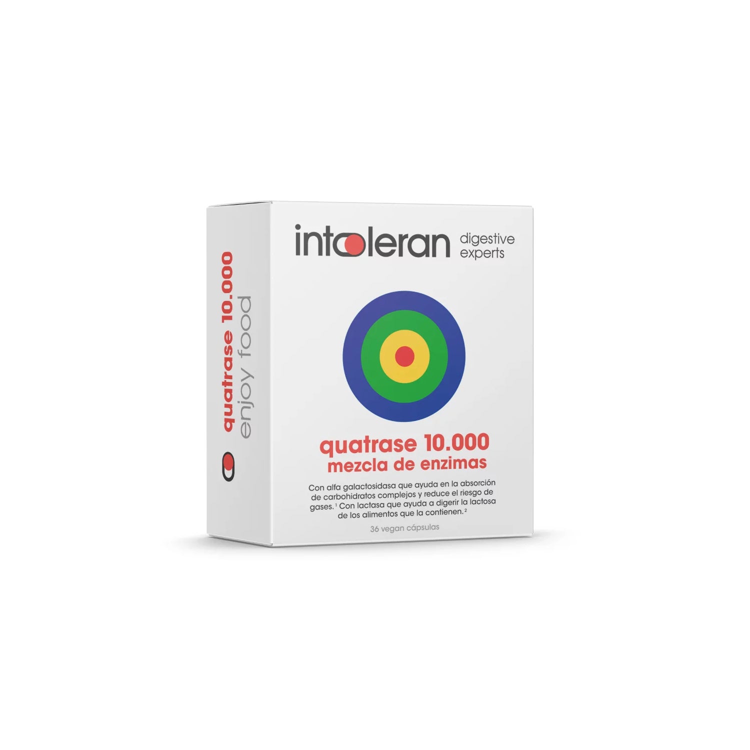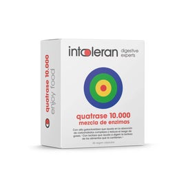Intoleran Quatrase 10.000 36caps é um suplemento alimentar formulado com uma mistura de enzimas digestivas, especialmente indicado para digerir hidratos de carbono complexos, como frutanos e galactanos, que podem ser encontrados em alimentos como leguminosas, vegetais e cereais.