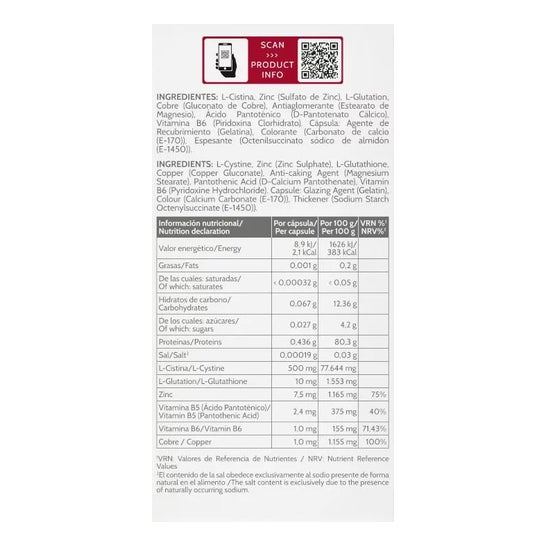 L-CIISTINA (500MG) L-Glutadiona (10 mg), Zinco (7,5 mg), Cobre (1 mg), Vitamina B5 (2,21 mg), Vitamina B6 (1 mg).