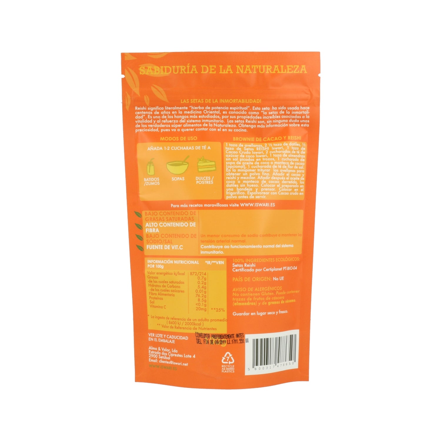 Reishi orgânico em pó, segundo a medicina tradicional chinesa, este cogumelo achatado e de sabor amargo é um dos alimentos mais importantes para promover a longevidade. O cogumelo Reishi é uma fonte de vitamina C e pode ser facilmente incorporado nas suas refeições. Produto feito com ingredientes 100% biológicos a partir de corpos de cogumelos reishi em pó. Baixo teor de gordura saturada e sódio/sal. Alto teor de fibras e fonte natural de vitamina C. Aviso de alergénios: Sem glúten. Pode conter vestígios de frutos de casca rija (amêndoas e avelãs), aveia (sem glúten), sementes de sésamo e amendoins.