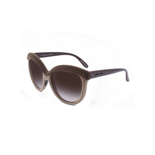 Óculos de sol que ajudam a proteger os olhos dos raios solares nocivos (UV, UVA e UVB). Ajudam a evitar que as impurezas e a poluição entrem na estrutura ocular, promovendo ao mesmo tempo uma visão clara. Além disso, promovem a saúde visual e reduzem o encandeamento. Fabricados com uma armação de acetato em forma de olho de gato, em castanho, revestida a veludo. Possuem ainda lentes de vidro mineral com índice de proteção de categoria 2. Testados oftalmologicamente. Marcação CE.