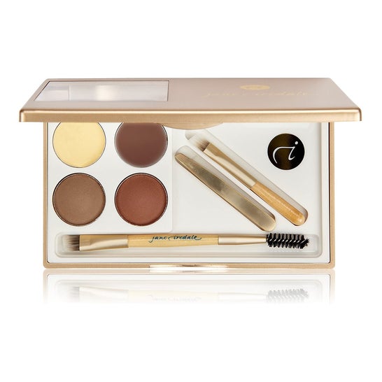 Kit de maquilhagem de sobrancelhas de qualidade profissional num estojo portátil e prático para maquilhagem ou retoques em viagem. Inclui uma escova dupla, uma base em pó altamente pigmentada e de longa duração e uma cera para facilitar a depilação de pêlos teimosos.