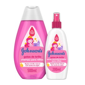 Johnson's Baby Shine Drops Pack é um conjunto de cuidados capilares para crianças composto por 1 shampoo gotas de brilho 500ml e 1 condicionador em spray 200ml.