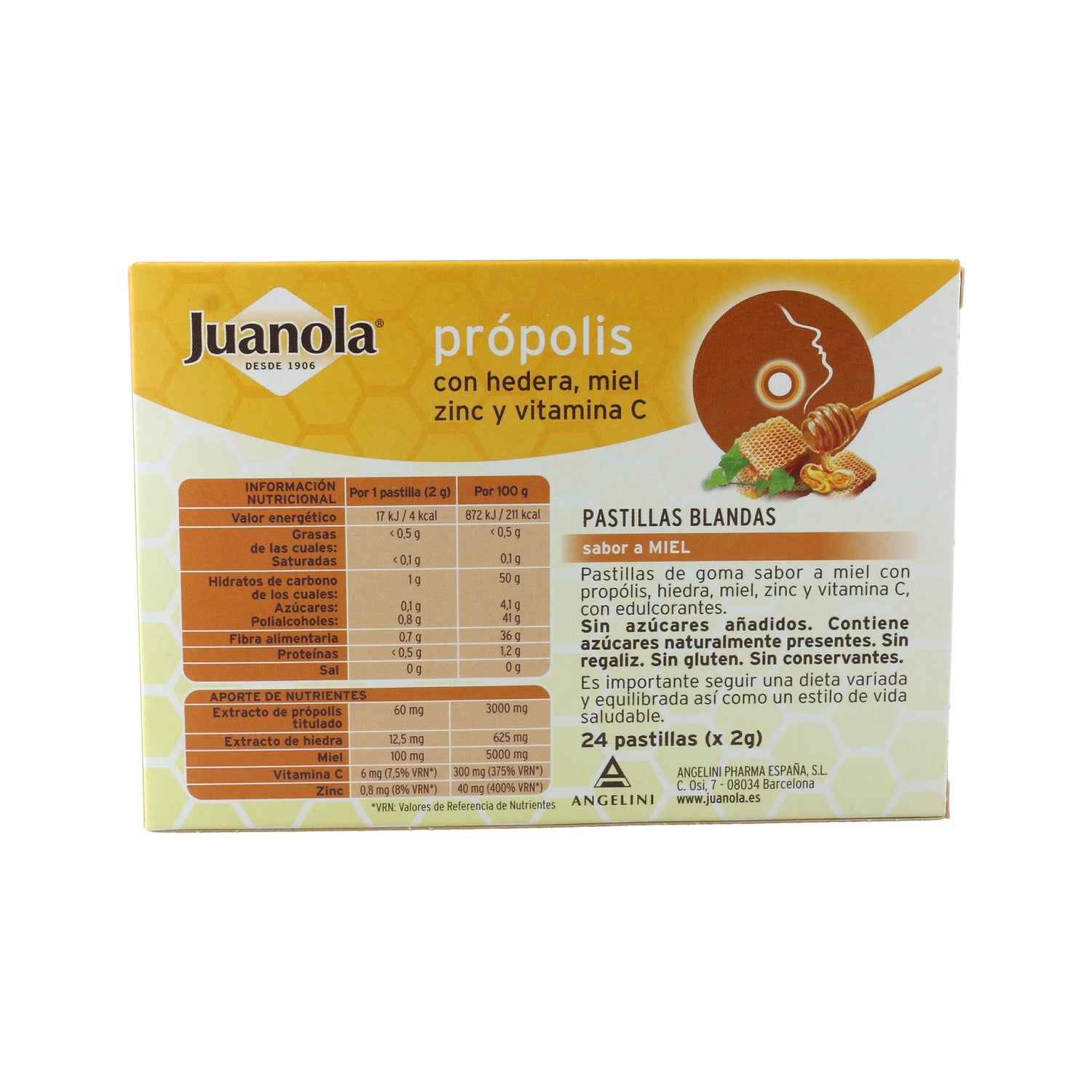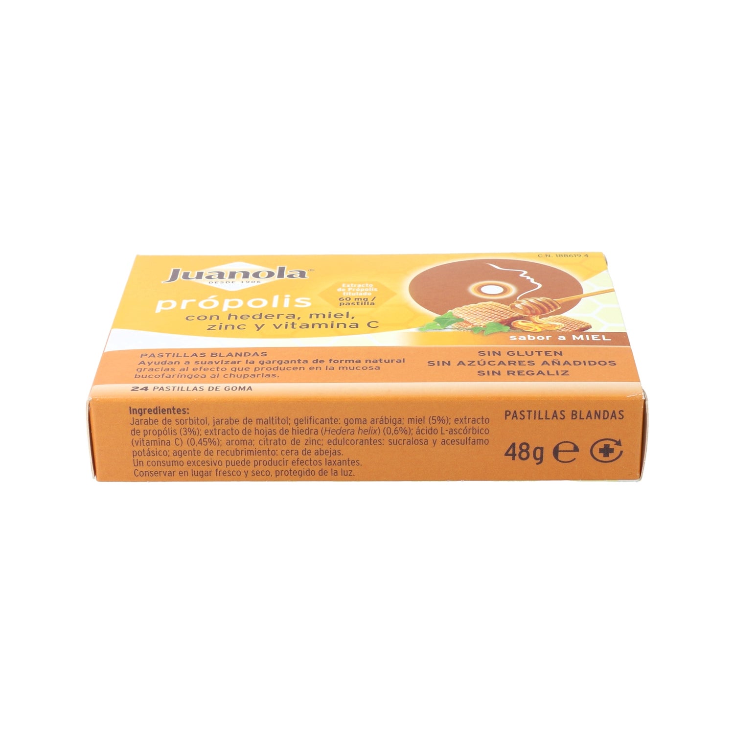Suplemento alimentar em forma de pastilhas moles, à base de extrato de própolis, hera, mel, zinco e vitamina C. Indicado para acalmar a garganta em caso de gargarejos e constipações. A ação dos seus ingredientes melhora e acalma as inflamações da orofaringe. Reduz a comichão e a rouquidão provocadas pela mucosa das vias respiratórias superiores.