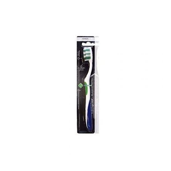 Escova de dentes de cerdas fortes para a higiene oral diária. Contribui para a limpeza dos dentes e ajuda a prevenir o aparecimento de cáries e tártaro. Favorece a remoção da placa bacteriana e facilita um hálito fresco. O tamanho da cabeça está adaptado anatomicamente, elaborado com fibras de diferentes comprimentos que alcançam as áreas de difícil acesso. Contém filamentos de borracha nas laterais que proporcionam uma massagem tonificante às gengivas. Com uma pega ergonómica.