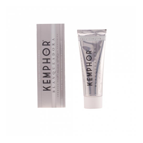 Creme Branqueador Dental Kemphor 75ml. é formulado com tomilho e essências naturais que o tornam adequado para dentes sensíveis. limpa suavemente manchas e resíduos alimentares. restaura o branco natural dos dentes. melhora a sensibilidade ao frio e ao calor, alimentos ácidos ou açúcares. a sua utilização protege o esmalte e as gengivas. tem acção anti-tartárica.