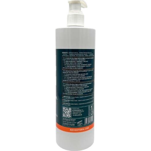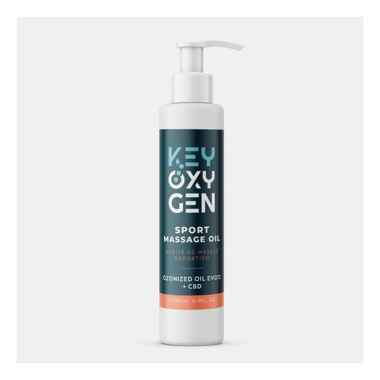 Keyoxygen Sport Massage Oil 500 ml é um óleo muscular projetado para proporcionar relaxamento e revitalização. Este produto combina Óleo de Azeite Virgem Extra Ecológico Ozonizado, que atua como um poderoso umectante, e outros ingredientes que contribuem para o bem-estar muscular e para a recuperação após o exercício.