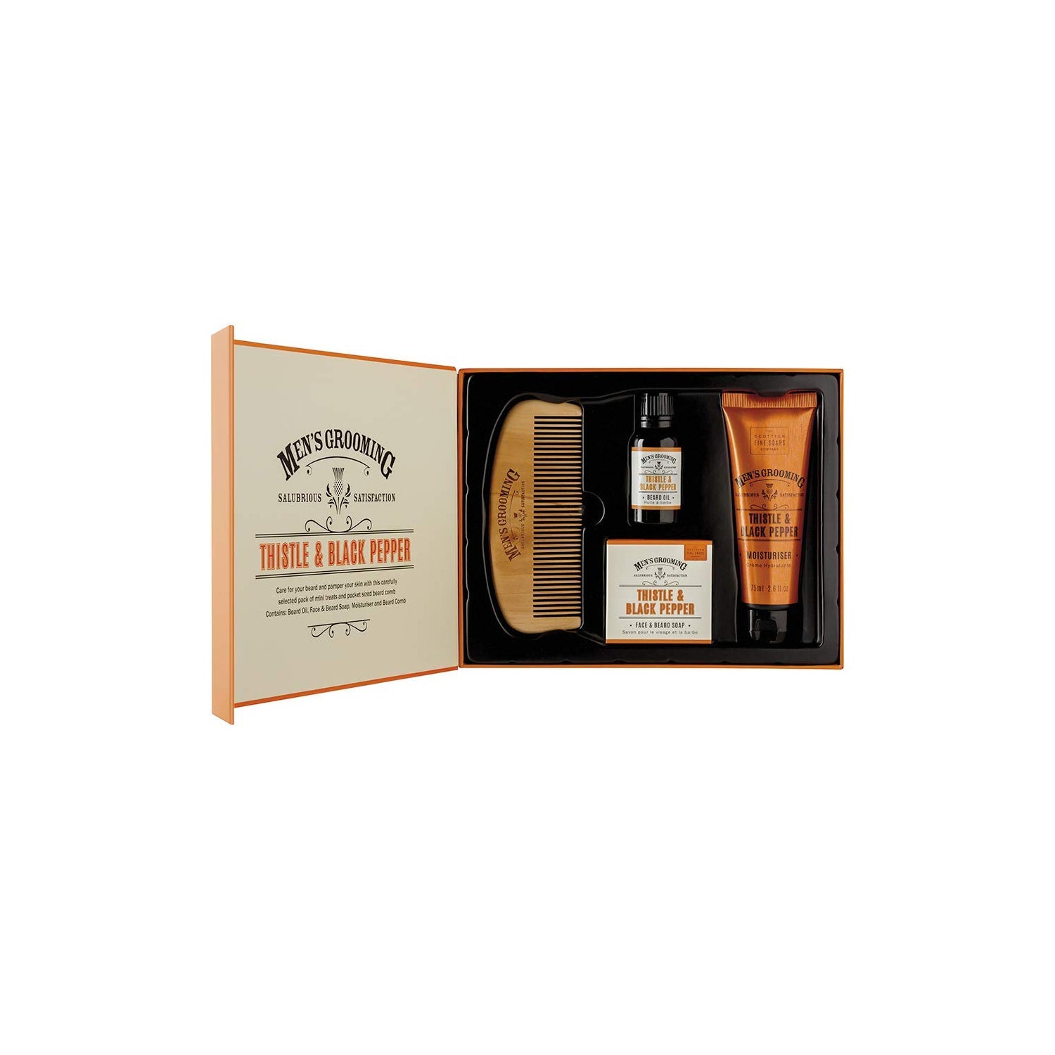Conjunto de cuidados de barba, feito com uma colecção de produtos de cuidado pessoal para manter a barba em óptimas condições. Contém: sabão facial e de barba, óleo de barba, hidratante, pente de barba de madeira dura. A fórmula é enriquecida com cardo de leite purificante e contém fragrância revigorante de pimenta preta, sândalo e espinheiro marinho.