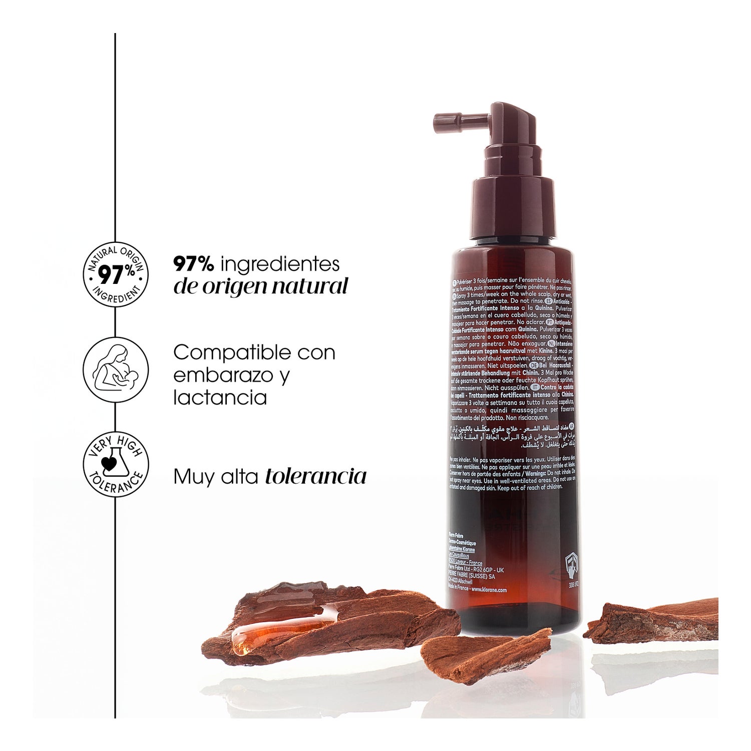 Elaborado com Quinina, cafeína e camu-camu, com uma alta concentração de vitamina C, contribui também para reduzir a perda de cabelo relacionada com o estresse. Além disso, o spray é de fácil aplicação e não deixa uma sensação oleosa, nem pegajosa.
