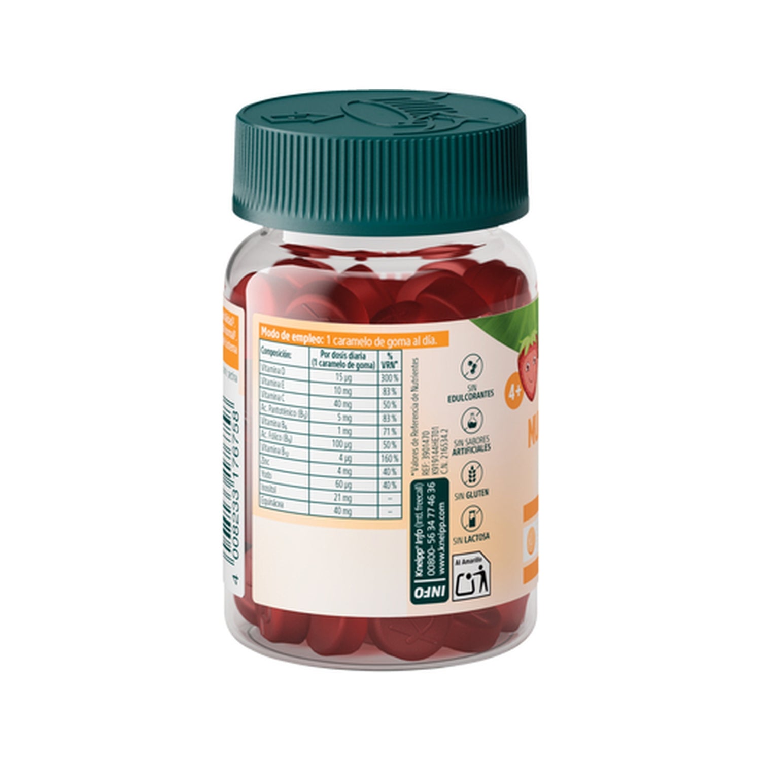 Kneipp Gummies Children Multivitamins promove a vitalidade com vitamina B6, apoia a função cognitiva com iodo e fortalece o sistema imunitário com zinco, vitaminas C e D. Sem adoçantes artificiais. Sabor a morango.
