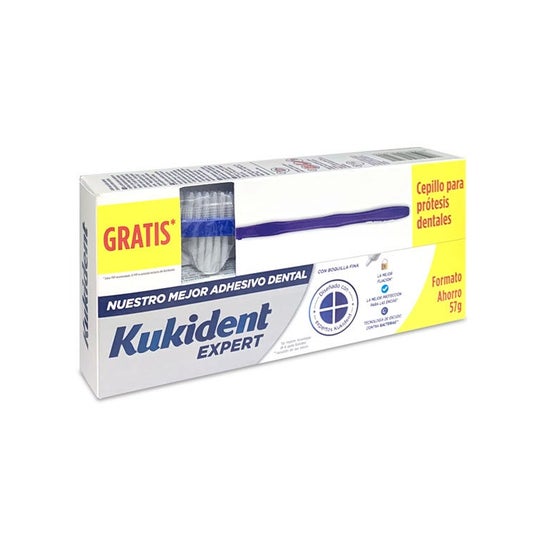 Kukident Expert Toothpaste 57g + Conjunto de Escova é um creme adesivo que ajuda a reduzir o movimento e o atrito das próteses e forma um selo superior entre a dentadura e a pastilha elástica. Também ajuda a parar o crescimento de bactérias ligadas ao mau hálito e tem uma boquilha superfina para facilitar a sua aplicação. Sabor suave a menta