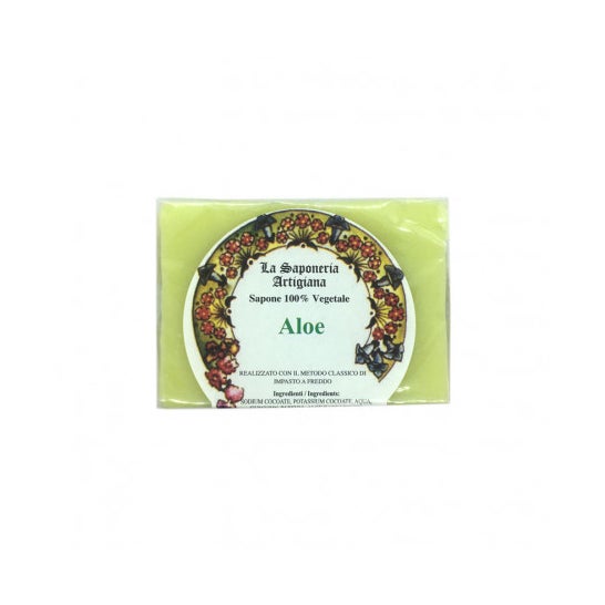 Sabão artesanal com extracto de Aloé vera, um produto fabricado de acordo com a antiga tradição do método da massa fria, a fim de manter as propriedades máximas do produto acabado. Sendo enriquecido com Aloe vera, ajuda a curar e regenerar a pele danificada, graças ao seu conteúdo em lignina. Esta enzima penetra na pele até 3 vezes mais do que a água, pelo que é especialmente útil para regenerar tecidos.